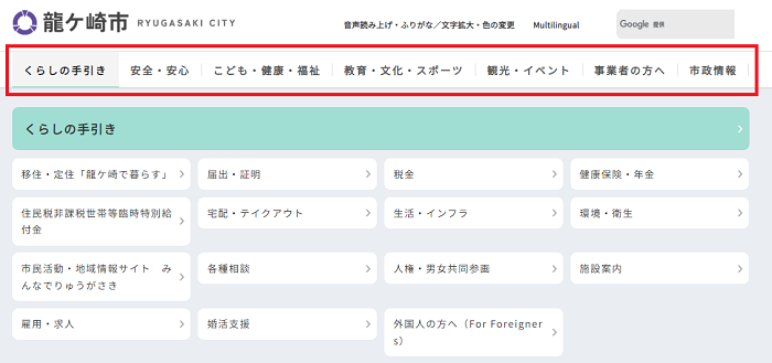 当サイトの情報は、基本的に「くらしの手引き」「安全・安心」「こども・健康・福祉」「教育・文化・スポーツ」「観光・イベント」「事業者の方へ」「市政情報」に分類し提供しています。