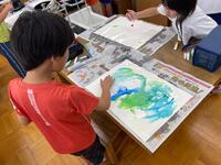 図工の学習では、画用紙に水を垂らす作業から始まりましたが、みんな心配そうな表情でした。絵具を指や筆で広げていくと、綺麗な模様が広がり、綺麗な作品ができあがりました。