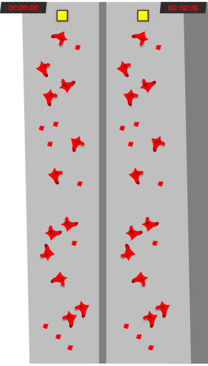 一般的には予選と決勝トーナメントで行われ、予選では同一コースが配置された2つの壁でそれぞれ1トライずつの計2トライ、決勝トーナメントではどちらかの壁で1トライのみ行うことができます。予選は2トライのうち早い方のタイムを使用することができ、基本的には予選参加者の上位16名が決勝トーナメントに進出します。