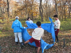長山中の1年生は小学生に声をかけながら、率先して落ち葉集めに取り組むなど環境整備に努めました。