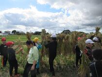 5年生は、横田農場で稲刈り体験をしました。稲を刈るだけでなく、刈った稲を束ねておだがけにしたり、割り箸を使って脱穀をしたりするなど、様々な体験をさせていただきました。横田農場の皆様、お世話になりました。ありがとうございました。