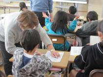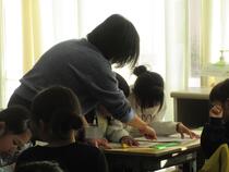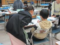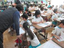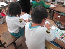 2年生の算数では、繰り上がりのあるたし算とひき算の学習をしています。子供たちは、単元のまとめのプリントに取り組んでいました。友達が困っている時、「こうやるんだよ。」「あ、そうか、分かった。」など、自然に学び合う子供たちの姿が見られます。長山小学校では、「支え合い学び合う学習集団づくりを目指しています。