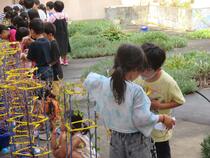 2年生の生活科では、子供たちが各々の好きな野菜を育てています。先日は、鳥に食べられないようにするにはどうすればよいかをみんなで考えていました。その結果、かかしを作ったり、CDをぶら下げたりして、工夫しました。収穫まで、観察した生長記録をタブレットに蓄積しながら、大切に大切に育てていきます。