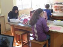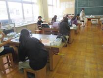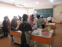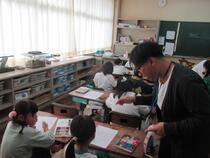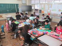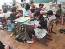 6年生の図工では、「くるくるクランク」という題材に取り組んでいました。子供たちは、色画用紙に魚や馬や船などを描いて、竹ひごに貼り付けていました。うまく動くように調整したり作り直したりするなど試行錯誤する姿が見られました。完成が楽しみです。