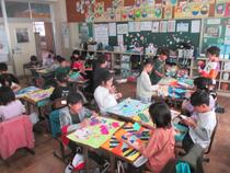 2年生の図工では、「ふしぎなたまご」という絵画づくりに取り組んでいます。教室には、折り紙やセロハン紙など豊富な材料が準備されており、子供たちはどの材料をどのように組み合わせるかを考え、選びながら楽しそうに活動していました。完成間近です。
