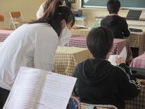 1年生の音楽では、長山小学校の校歌を練習していました。子どもたちは、あっという間に覚えて、1番を大きな声で歌うことができました。「2番も歌いたい!」「3番も!」と、子どもたちは、学習に対して意欲満々です。