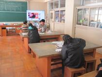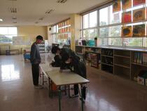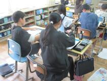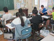 6年生の算数では、単元のまとめのプリントに取り組んでいました。平行四辺形の面積を求める問題では、「ここ分からないから、教えて。」「この問題はね・・・。」と友達と学び会う子供たちの姿が見られました。学級の仲間と共に支え合う関係を築いています。