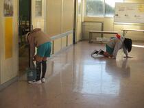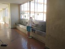 6年生の清掃の時間の様子です。黙々とオープンスペースや水道などの共有場所をきれいにしていました。一生懸命活動する姿を下級生に示してくれるので、よいお手本になっています。
