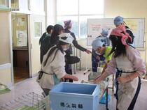 5年生の家庭科では、調理の学習をしていました。子供たちは、青菜をゆで、食べやすい大きさに切るなど、手順よく調理することができました。おそるおそるピーラーでジャガイモの皮をむいていた子は、「初めてできた!」と喜んでいました。
