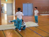 1年生と2年生の合同体育では、マット遊びをしていました。2年生がお手本を見せ、1年生に優しく教えていました。子供たちは、仲良く楽しそうに学習していました。「こうやってやるんだよ。」「上手にできたね。」