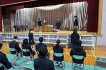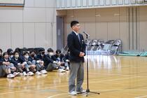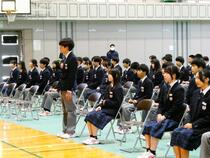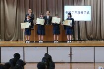 本日、表彰式および修了式を行いました。各クラスの代表生徒が修了証を受け取り、学年代表による1年間の振り返りの発表がありました。学習や部活、クラブチームでの努力を続けたことや、学級代表として皆と生活上の課題を話し合って解決してきたことなど、自立や共生に向けての取り組みを発表していました。