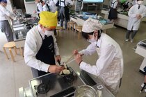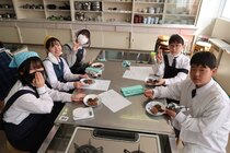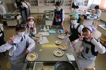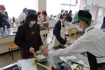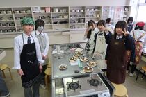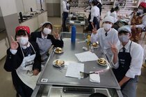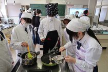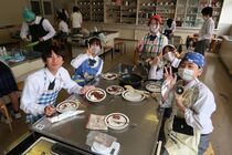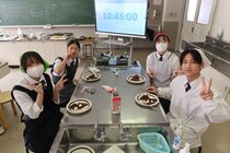 これまで「お菓子づくりコンテスト」と紹介してきましたが、「お菓子選手権」でした。本日3日目を迎え、1年2組が挑みました。メニューは、「パンケーキ」、「ホットケーキサンドアイス」、「ダブルチョコスコーン」、「スコーン&ホットケーキ」、「スコーン」、「クレープ」でした。今までのクラスとは違うメニューがいくつもあり、焼き加減に細心の注意を払い調理していました。「ダブルチョコスコーン」のグループは、作っているうちに「ガトーショコラ風」になってしまうという奇跡の仕上がりとなり、家庭科担当を驚かせました。