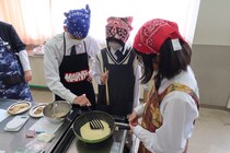 「お菓子づくりコンテスト2日目」は、1年1組が行いました。本日のメニューは、「チョコシフォンケーキ」、「ガトーショコラ」、「フライパンバナナケーキ」、「チョコバナナクレープ」、「バームクーヘン風」、「ホットケーキ」でした。自分たちが作成したレシピを見ながら、仲良く調理していました。