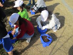1年生は、あさがおを育てていた植木鉢にチューリップの球根を植えました。植木鉢に新しく土を入れ、球根を丁寧に植えていきました。これからお水をあげたり草を抜いたりしながらお世話し、春の開花を待ちます。1年生が終わる頃には立派なチューリップの花が咲いていることでしょう。楽しみですね。