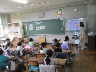 1、2年生は年間10回程度の外国語の授業を行うことができます。1年生の4回目の外国語の授業は「えいごですうじをれんしゅうしよう」です。1から10までの数字を歌やクイズ、児童同士のやりとりを通して学習しました。本校ALTのマリア先生が、毎回楽しいクイズや活動を取り入れて授業を行っているので、45分があっという間に過ぎていきます。「もう1回歌が歌いたい!」とリクエストする児童も見られました。
