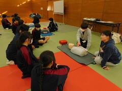 大学生の皆さんに丁寧にご指導いただき、胸骨圧迫の仕方やAEDの使い方を学びました。