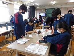 3年生の美術では、「篆刻(てんこく)」の授業をしています。今日は完成したものをお互いに押し合う交流活動の時間でした。