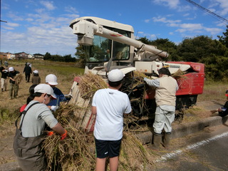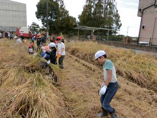 6月に植えたお米の苗がよく育ち、立派な穂を実らせました。子供たちは、稲を刈るチーム、刈った稲をコンバインに持っていくチームなどに分かれて、一生懸命活動しました。今後、収穫した籾を精米し、おいしい「龍西米」にしていきます。