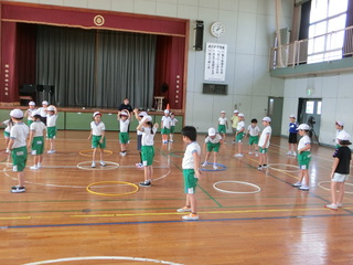 また、2年生では体育の授業で、跳ぶ運動を行っています。様々な跳ぶ活動を取り入れたサーキットや、フラフープを目指して飛ぶ活動に、楽しく取り組んでいました。