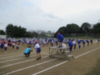 「龍の子紅白大合戦」で3・4年生が挑戦する団体種目の名前は「台風の目」です。これは3~4人のチームが1本を棒につかまり、カラーコーンの周りを回りながらコースを走り、次のチームへ棒をつないでいくというリレー種目です。本番を来週に控え、今日は実際に競技を行いながら入場から退場までの動きを確認しました。スタートの合図とともに、各組の第1走者が力強くスタートして競技が始まると、同じ組のチームを応援する子供たちの声が、グランドに大きく響いていました。