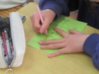 2年生は、図工の時間に紙を使った工作に取り組んでいます。作っているのは、窓のある建物です。今日は最初の授業ということで、1枚の工作用紙に、カッターナイフを使って様々な形の窓を作りました。窓は扉が開く形にするので、子供たちは蝶番になる部分を切ってしまわないように注意しながら丁寧に切り込みを入れていました。この後は、工作用紙を折り曲げて建物の形を作り、さらに一つ一つの窓の中にも、一人一人が想像した自分の世界を表現してきます。