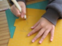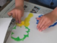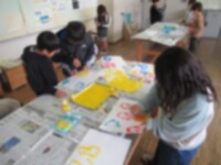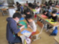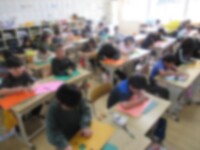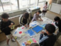 先日、1年生が図工の時間に紙版画に取り組んでいる様子を紹介しましたが、今日は、完成した版をもって美術室に移動し、専用の絵の具を使って彩色を行いました。子供たちは、スポンジに絵の具をしみこませ、丁寧に押し当てるようにしながら版の上に色をつけていきます。版には好きな形に切ったシールが貼ってあり、絵の具が乾いた後で、そのシールを剥がすときれいに形が浮かび上がります。子供たちは友達と相談したり、作品を見せ合ったりしながら楽しそうに活動していました。