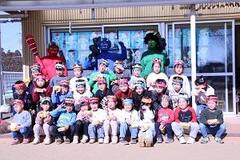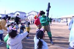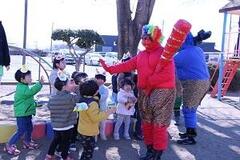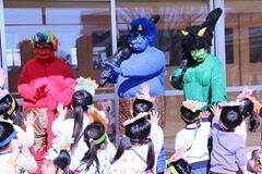 由来について話を聞き、ぶどう組の子どもたちにはインタビューで「心の中のどんな悪い鬼を退治したいか」を発表してもらいました。鬼が登場すると、自分で作ったお面と升を身につけ、一生懸命豆まきをしました。
