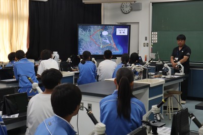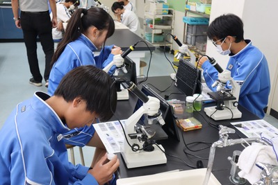 10月3日(金)2年生を対象に霞ケ浦環境科学センターの先生方が霞ヶ浦の環境とプランクトン観察の授業を行ってくれた。生徒たちは顕微鏡とタブレットを繋ぎ、大画面でプランクトンを観察した。どの生徒も鮮明に見えるプランクトンの動きに興味津々に観察を行うことができていた。