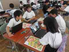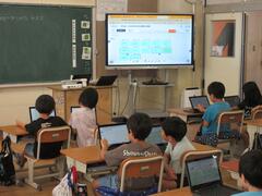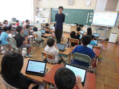 4年生は「茨城のおいしい食べ物を見つけよう」という内容で、タブレットを使って茨城で生産されている食べ物を調べました。メロンやクリ、レンコン、ピーマンなど、たくさんの茨城のおいしい食べ物を発見することができました。また、地産地消のよさにも気づいたようです。