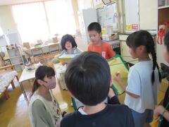 今日は、あいにくの雨でした。1年生は、中間休みに椅子取りゲームをしていました。また、図工では、「チョキチョキかざり」を作りました。七夕に向けて楽しみですね。
