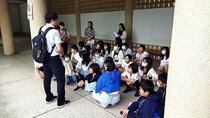 しっかりあいさつをして教室に入り、1年生の教室との違いに驚きながら、ワークシートにまとめていました。