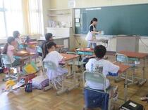 梅雨に入り行間休みに外で遊ぶことができないため、1年生の教室に6年生が勉強を教えに来てくれました。
