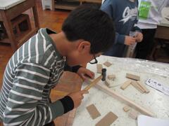 4年生は、「くぎ打ち」、「のこぎり引き」に夢中です。図工【解決する力・関わる力】