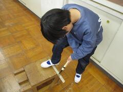 4年生が図工の学習で、のこぎりを使って木を切る学習を行っています。