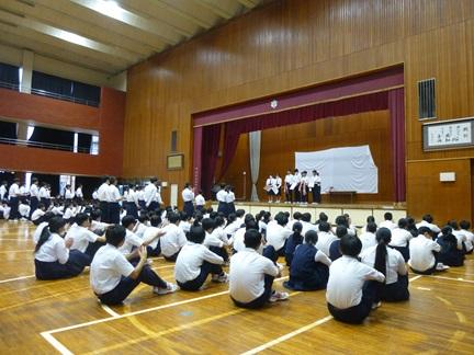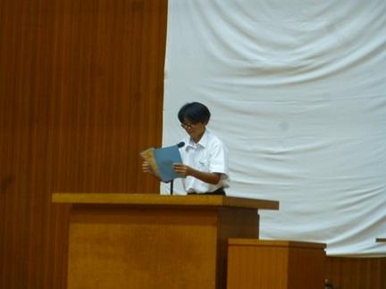 前期終業式が体育館で行われ、各学年の代表が前期に力を入れて取り組んだことや反省を発表しました。