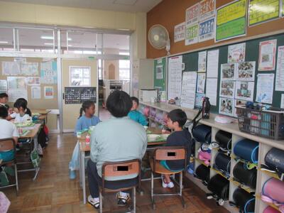 流通経済大学の学生さんがスポーツフェスティバルのお手伝いに来てくれました。子供たちと一緒に準備や後片付けに取り組んでくれ、助かりました。一緒に給食を食べられた子供たちが嬉しそうでした。