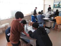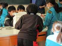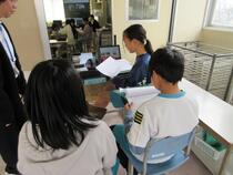 5年生の家庭科では、調理実習を行っていました。子供たちは、お茶をおいしくいれるためにはどうすればよいかを考えながら、学習していました。ガスの点火を初めて体験する子も多く、友達と教え合いながら活動していました。「つかないよ、どうすればいい?」「もう少しゆっくり回すんだよ。」