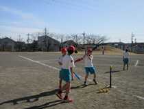 6年生の体育では、ベースボール型ゲームを学習しています。今日は、グループでティーボールに取り組みました。子供たちは、グループの友達と「どうしたらうまく飛ぶかな。」「もう少し大きく振ればいいよ。」などと、話し合いながら楽しそうに活動していました。