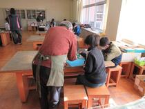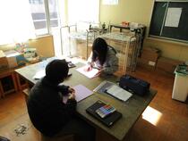5年生の図工では、版画を学習しています。好きな動物を版いっぱいに描き、彫刻刀で一生懸命に彫っていました。「細かいところが難しいな。」「この小丸刀を使えばいいんじゃない?」「そうだね、やってみる。」などと、友達と話しながら熱心に取り組む子供たちの姿が見られました。