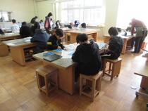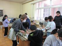 6年生の図工では、木版画を学習しています。「どうしたら、ここが白くなるかな。」「模様がしっかり出るためにはどうすればいいですか。」子供たちは、教師やスクールサポーターの皆様に相談しながら真剣な様子で彫り進めていました。完成が楽しみです。