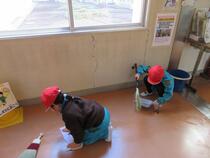 1年生の清掃活動の様子です。隅々まで床をふいた子供たちは、「あと1回やる!」と、再度床をふき始めました。水が冷たいこの時期ですが、1年生の子供たちは楽しそうに掃除をしています。自分たちだけで上手に掃除ができるようになりました。