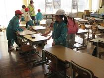 6年生の配膳の様子です。配膳台の準備をするという係の仕事を率先して取り組む子、係ではないけど素早く友達を手伝う子など、協力しながら活動する姿がいつも光っています。学年のリーダーとして、積極的に活動する子供たち、頼りになります。