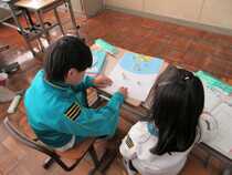 2年生の生活科では、学校探検の練習をしていました。今度、1年生を案内しながら学校探検をするための準備です。「走らないようにしないとだめだよ。」「1年生も走っちゃうよ。」「職員室は、(地図の)どこかな。」「1年生が分かるように印をつけておく?」子供たちは、グループで考えながら練習をしていました。