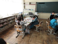 6年生の図工では、「くるくるクランク」という題材に取り組んでいました。子供たちは、色画用紙に魚や馬や船などを描いて、竹ひごに貼り付けていました。うまく動くように調整したり作り直したりするなど試行錯誤する姿が見られました。完成が楽しみです。