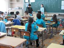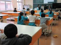 1年生の外国語活動では、「Head Shoulders Knees And Toes」の歌を学習していました。子供たちは、ALTのかけ声に合わせて、友達と一緒に楽しそうに歌ったり身体を動かしたりしていました。授業では、楽しい歌やゲームを通して、英語に親しむことができるように工夫しています。