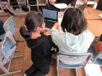 3年生の体育では、縄跳びを学習しています。子供たちは、タブレットで友達と動画を取り合いながら、跳び方を確認し、さらに上手に跳べるようになるためにはどうすればよいのかを考えていました。「手の位置が真ん中だね。」「だからずっと跳べるんだね。」友達と互いのいいところ探しをしながら楽しそうに学習していました。