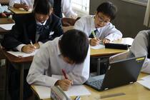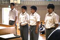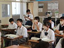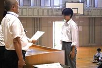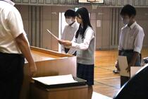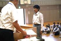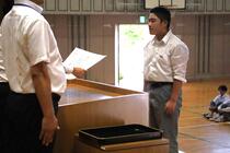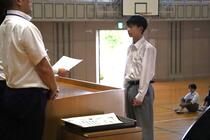 本日5校時に、市新人戦や作品展等の表彰式と前期終業式を行いました。学校長式辞では、前期の皆の頑張りをほめ、「何事にも全力で取り組むこと」・「人権意識の大切さ」・「メンタルトレーニングについて」の話があり、生徒たちは真剣に聞き入っていました。また、6校時は、全学級で通知表の受け渡しが行われました。生徒たちは、通知表に目を通しながら、担任と共に前期の学校生活を振り返っていました。