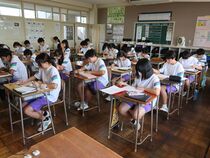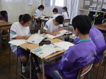 長い夏休みが終わり、生徒たちは元気に登校し、校門で挨拶を交わしました。1校時は全校集会で校長からの話をしっかり聞いていました。集会後は、教室に戻りクラスの友達や担任と久しぶりに触れあいました。2校時目から通常の授業が始まりました。生徒たちは、長期の休み明けとは思わせなく、真剣に取り組んでいました。また、養護教諭から「10分で書けるタイムマネジメントシート」が配付され、夏休み以降の自分の生活の見直しをしました。