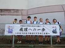 放課後、生徒会活動スローガンを記した横断幕を道沿いのフェンスに掲示しました。