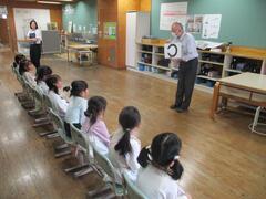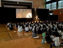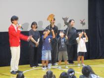 子供たちは、スクリーンに映される様々な光や、ナレーションの方の語りに引き込まれ、物語を楽しんでいるようでした。影絵劇の後には、影絵教室が行われ、影絵劇の仕組みについて教えていただきました。さらに、3人の子供たちが代表で、実際に影絵で使われている人形の操作を教えていただき、操作を体験することができました。